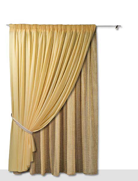 | DESCRIZIONE: La sopratenda è una garza indiana stropicciata di media trasparenza color giallo; la sottotenda è in organza opaca color oro chiaro con righe di ciniglia in rilievo in tinta. |