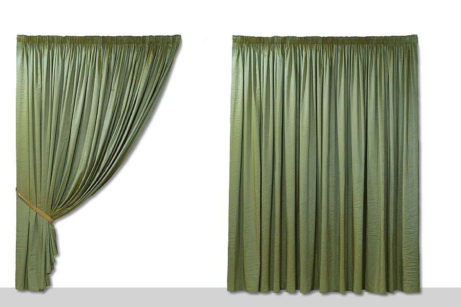 DESCRIZIONE: Il tendaggio proposto è in taftà stropicciato cangiante color verde brillante.
